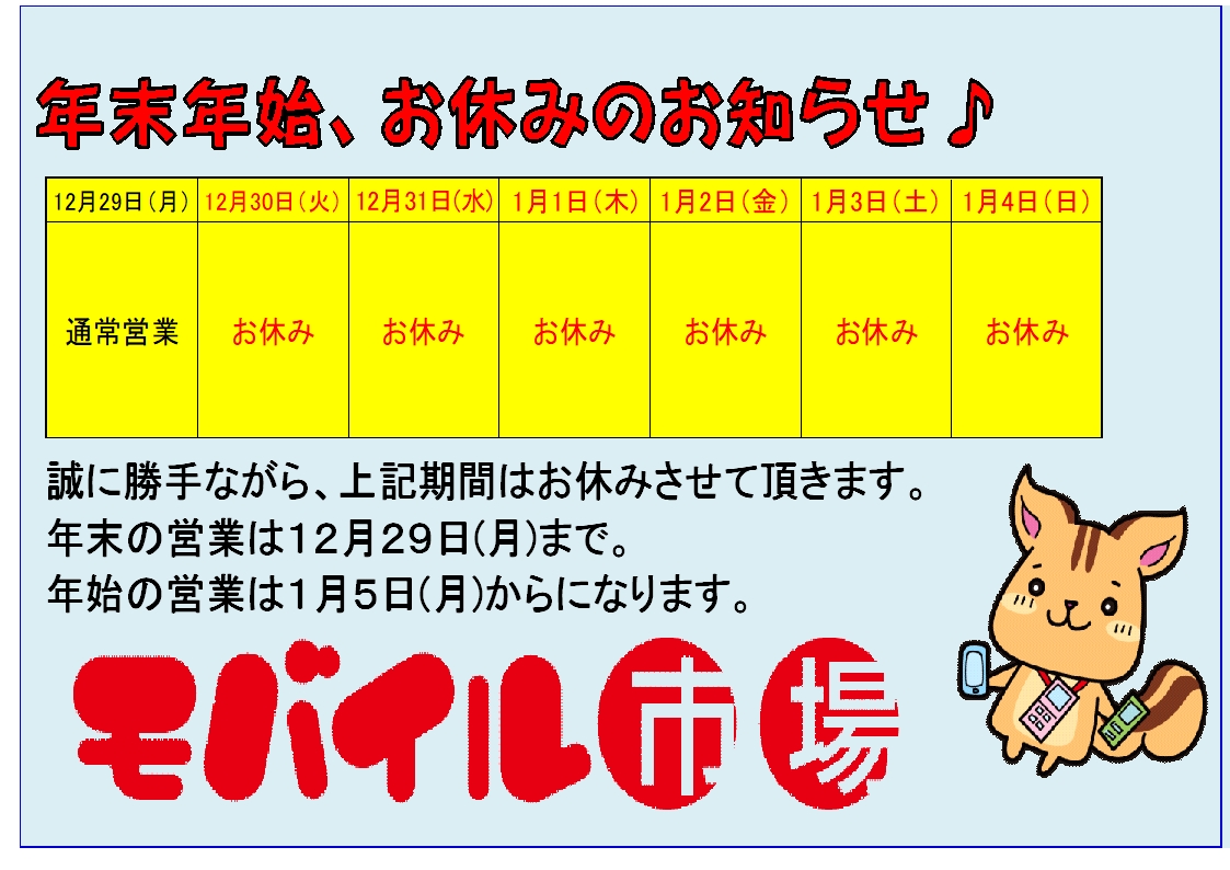 年末年始・お休みのお知らせ♪12月30日(土)~1月4日(木)までお休みさせて頂きます♪♪